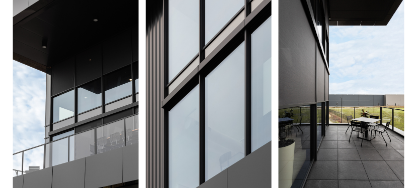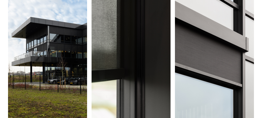 Maar liefst 64 screens van ongeveer 1m80 bij 3m50 tellen de vliesgevels van het nieuwbouwcomplex in totaal. En daarvan nam Renson Ambassador Jaleco Havaro BV uit Papendrecht zowel de engineering, levering als plaatsing voor z’n rekening. Stefan Bakker (Jaleco Havaro): “Het was algemeen aannemer Molenschot Industriebouw die bij ons kwam aankloppen op zoek naar de geschikte screens voor de vliesgevels. “In overleg met de klant werd voor Fixscreen Minimal CW50 doekzonwering gekozen omdat die het minste opvalt”, aldus Dario Claassen van bouwkundig aannemer Molenschot Industriebouw.